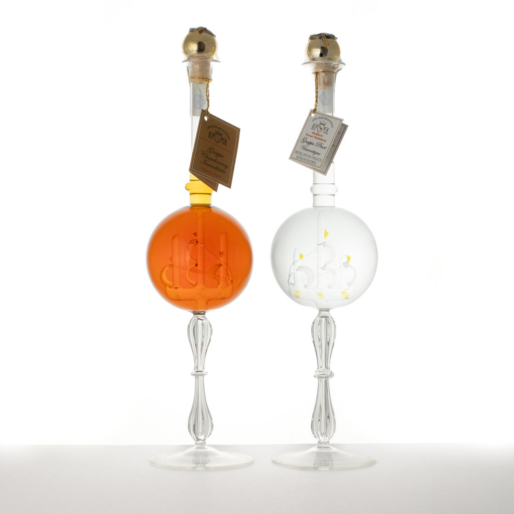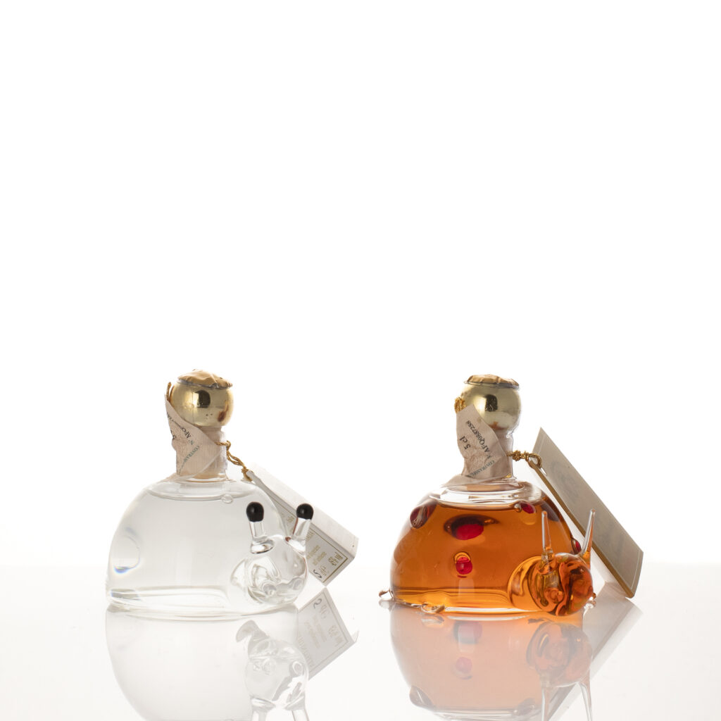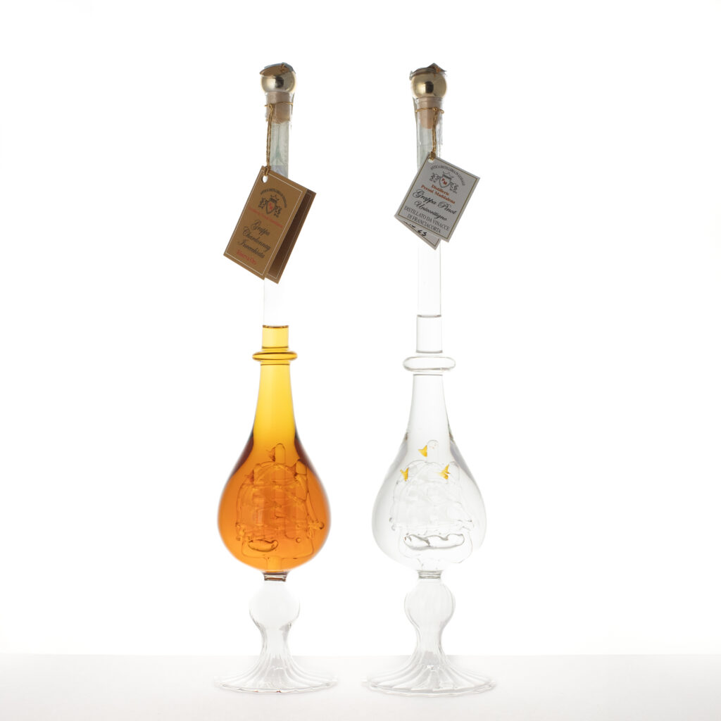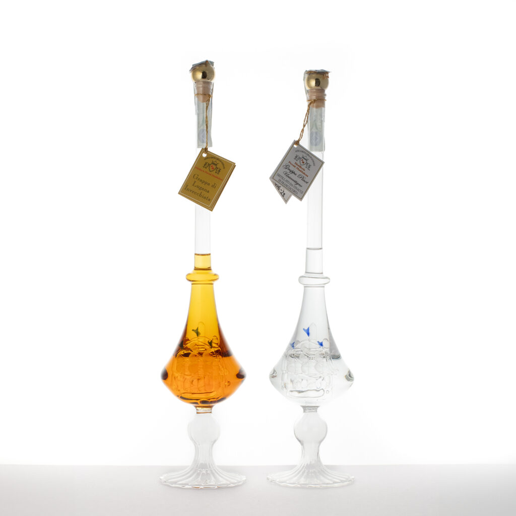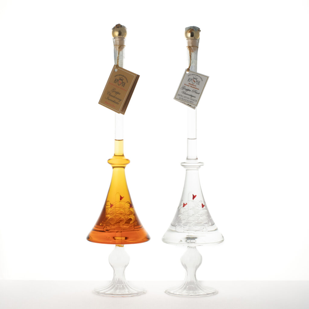 Il vetro soffiato può assumere forme e funzioni innumerevoli; per le Distillerie Peroni Maddalena vengono prodotti artigianalmente vetri decorati e coniati in centinaia di forme, pensati e disegnati per imbottigliare la grappa Distillerie Peroni Maddalena. Semplicemente considerati decorativi, soprammobili o bottiglie, la famiglia le ha trasformate anche in splendide, uniche e rare bomboniere.